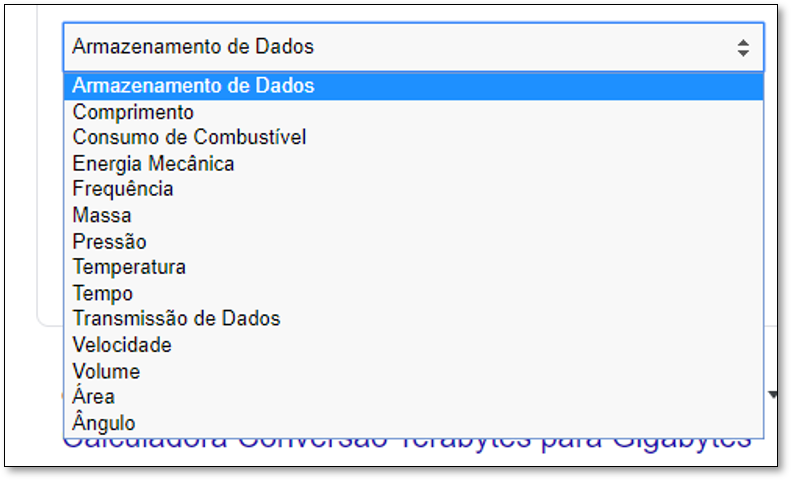 Os exemplos acima são apenas algumas das muitas conversões que o Google pode realizar. Se você clicar na caixa de seleção logo acima dos valores (que na imagem acima mostra “Armazenamento de Dados”) você conseguirá ver todas as categorias nas quais o Google é capaz de efetuar conversões: