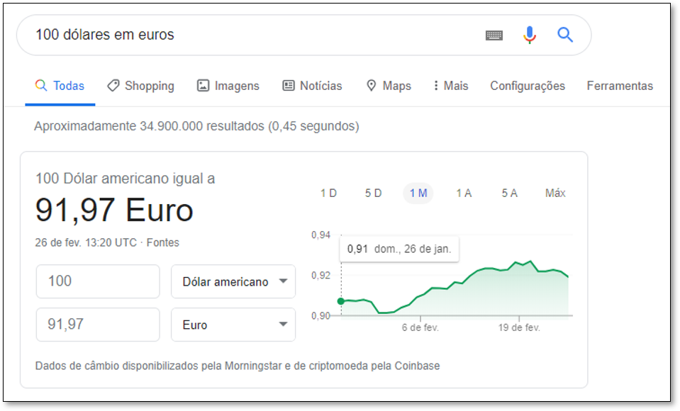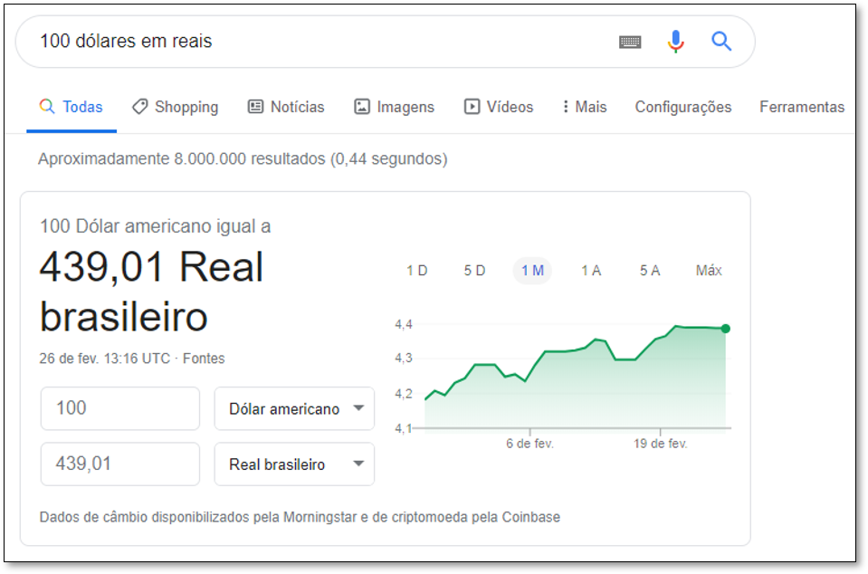 Você também pode usar o Google para consultar informações financeiras úteis, como o câmbio. Quer saber a quantos reais 100 dólares equivalem atualmente? Apenas digite 100 dólares em reais e você vai ter a resposta imediatamente:
