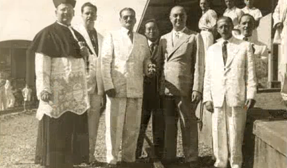 Autoridades aguardando a chegada do primeiro trem: Padre Jerônimo, Dr. Nogueira, Jamil de Lima, Ihity Endo, Deputado Salles Filho, Antônio Goulart Marmo e Francisco Gimenes Roda Filho (Acervo).