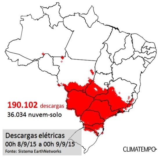 De acordo com o Climatempo, durante as 24h do dia 8 de setembro foram registrados 190.102 descargas elétricas e todo o Brasil, concentradas no centro-sul, sobretudo nos estados de São Paulo, Paraná, Mato Grosso do Sul, e parte dos Estados de Minas Gerais, Santa Catarina, Mato Gross, Goiás e Mato Grosso.
