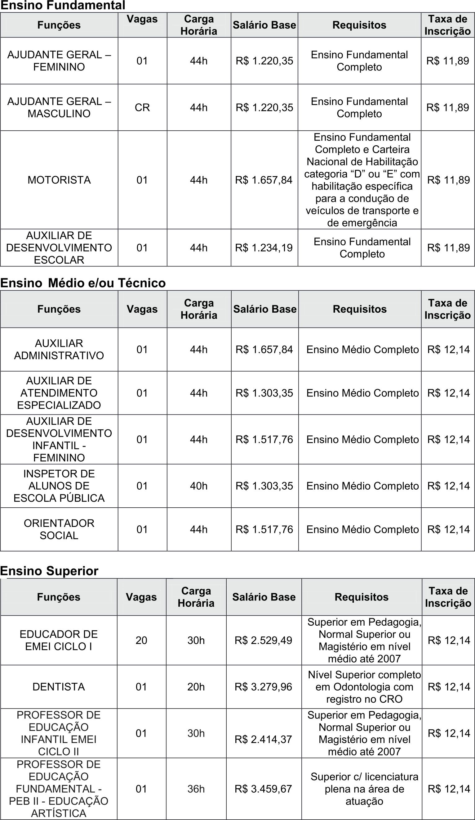 Conforme o Edital de Concurso Público Nº 01/2022, as vagas são para os cargos de ajudante geral (feminino), ajudante geral (masculino), auxiliar administrativo, auxiliar de atendimento especializado, auxiliar de desenvolvimento escolar, auxiliar de desenvolvimento infantil (feminino), dentista, educador de Emei ciclo I, inspetor de alunos de escola pública, motorista, orientador social, professor de educação infantil Emei ciclo II e professor de educação fundamental – Peb II educação artística.