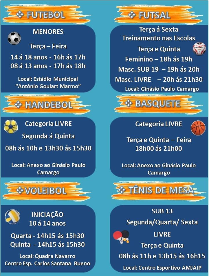 Escolinhas são para as modalidades futebol, futsal, voleibol, basquete, handebol e tênis de mesa.