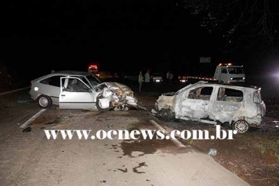 Ontem (3), por volta das 20h,aconteceu um acidente na rodovia SP 425 Assis Chateaubriand Km 370 + 600 metros envolvendo três (03) veículos sendo um veículo Uno com placas de Osasco-SP, um veículo Kadet com placas de Parapuã – SP, um Eco Sport placas de Tupã. Segundo consta o Fiat Uno trafegava sentido Rinópolis/Martinópolis e no local acima citado efetuou ultrapassagem em local proibido colidindo frontalmente com o veículo Kadet, após a batida o veículo Uno pegou fogo totalmente já com as vítimas fora do veículo.