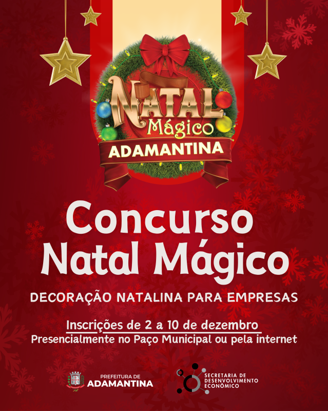 A Prefeitura de Adamantina abriu as inscrições para o concurso Natal Mágico, que premiará as melhores decorações natalinas de empresas do município. O anúncio foi feito na última sexta-feira (28), durante a cerimônia oficial de abertura da 19ª edição do Natal Mágico, marcada pelo tradicional acender das luzes.