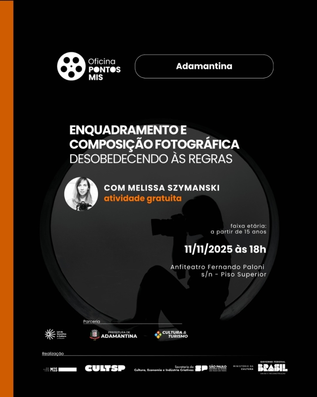 Na próxima terça-feira (11), Adamantina sediará a oficina gratuita “Enquadramento e Composição Fotográfica – Desobedecendo às Regras”, ministrada pela fotógrafa Melissa Szymanski. O evento será realizado a partir das 18h, no Anfiteatro Fernando Paloni, com duração de quatro horas.