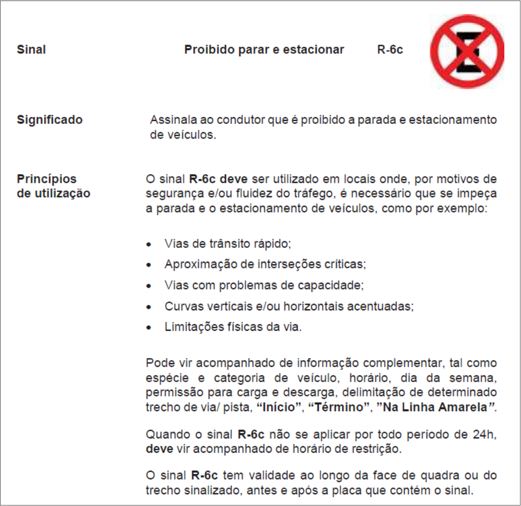 Conforme o Manual Brasileiro de Sinalização de Trânsito, editado pelo Contran (Conselho Nacional de Trânsito), a placa R-6c, que indica “proibido parar e estacionar”, assinala ao condutor que é vedada tanto a parada quanto o estacionamento de veículos ao longo do trecho sinalizado.