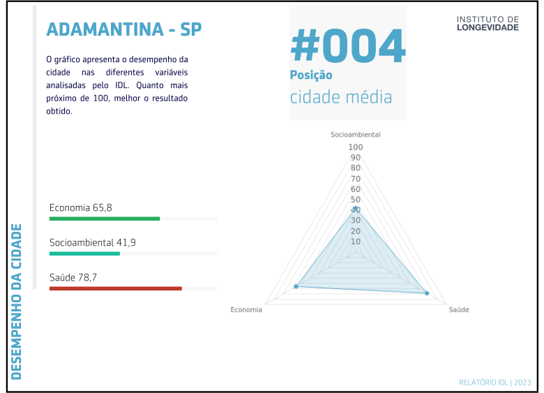 Adamantina é a quarta cidade do país no Índice de Desenvolvimento Urbano para a Longevidade (IDL). O ranqueamento foi mostrado em uma reportagem sobre o tema na noite desta quinta-feira (26) no Jornal Nacional (assista aqui). Criado pelo Instituto de Longevidade, o IDL é um instrumento que mede do grau de preparação dos municípios brasileiros para o envelhecimento de suas comunidades.