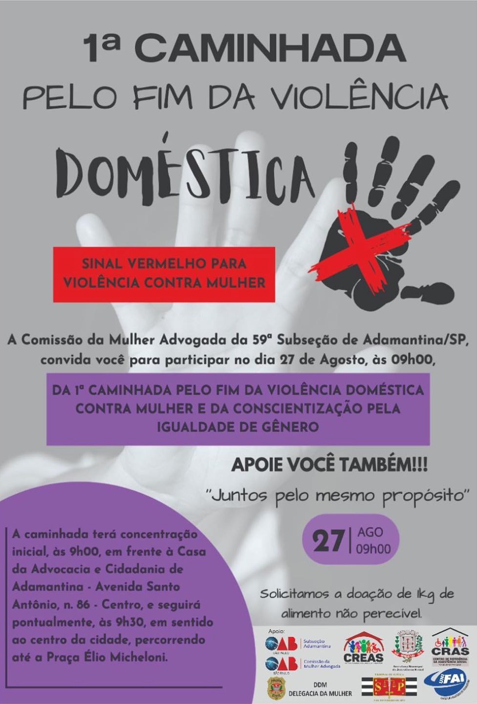 Entre as ações, está a realização no sábado, 27 de agosto, da “1ª Caminhada pelo fim da violência doméstica contra a mulher e da conscientização pela igualdade de gênero”. A iniciativa é da Comissão da Mulher Advogada da 59ª Subseção de Adamantina.