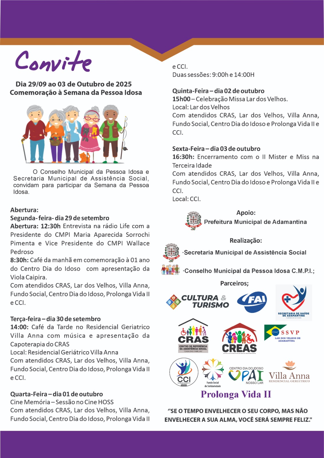 A iniciativa conta com apoio das secretarias municipais de Cultura e Turismo e de Saúde, além de instituições parceiras como FAI, CRAS, CREAS, Lar dos Velhos, Centro de Convivência do Idoso (CCI), Fundo Social de Solidariedade, Centro Dia do Idoso, Villa Anna e Prolonga Vida II.