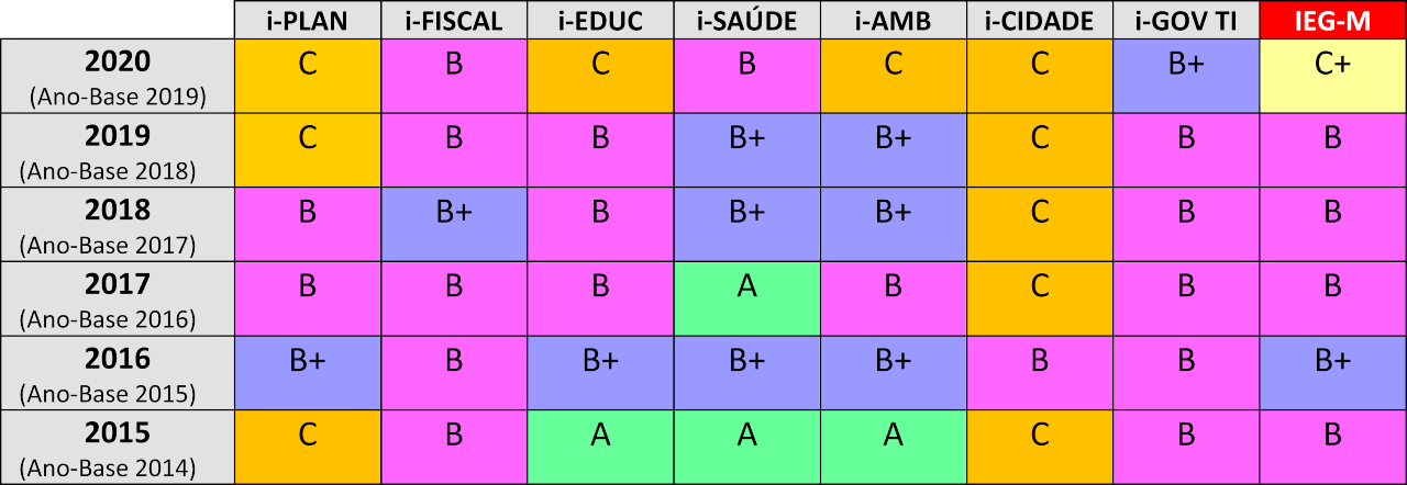 O IEG-M possui cinco faixas de resultados, definidas a partir das notas obtidas em sete índices setoriais. Em cinco escalonamentos, as notas variam de “A” (altamente efetiva) a “C” (baixo nível de adequação).