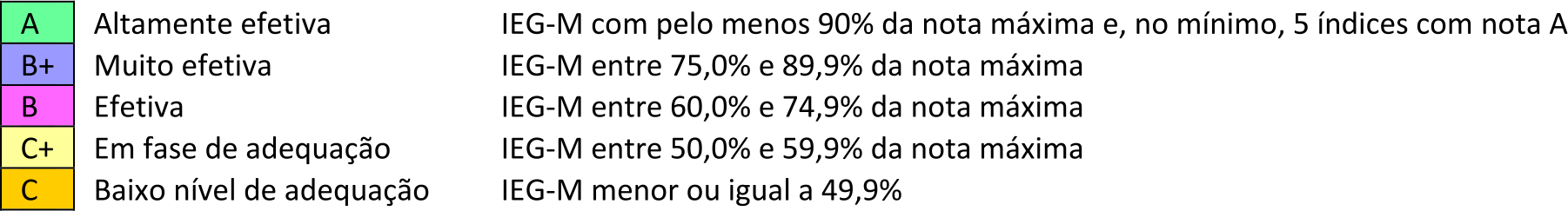 • A | Altamente efetiva: IEG-M com pelo menos 90% da nota máxima e, no mínimo, 5 índices com nota A