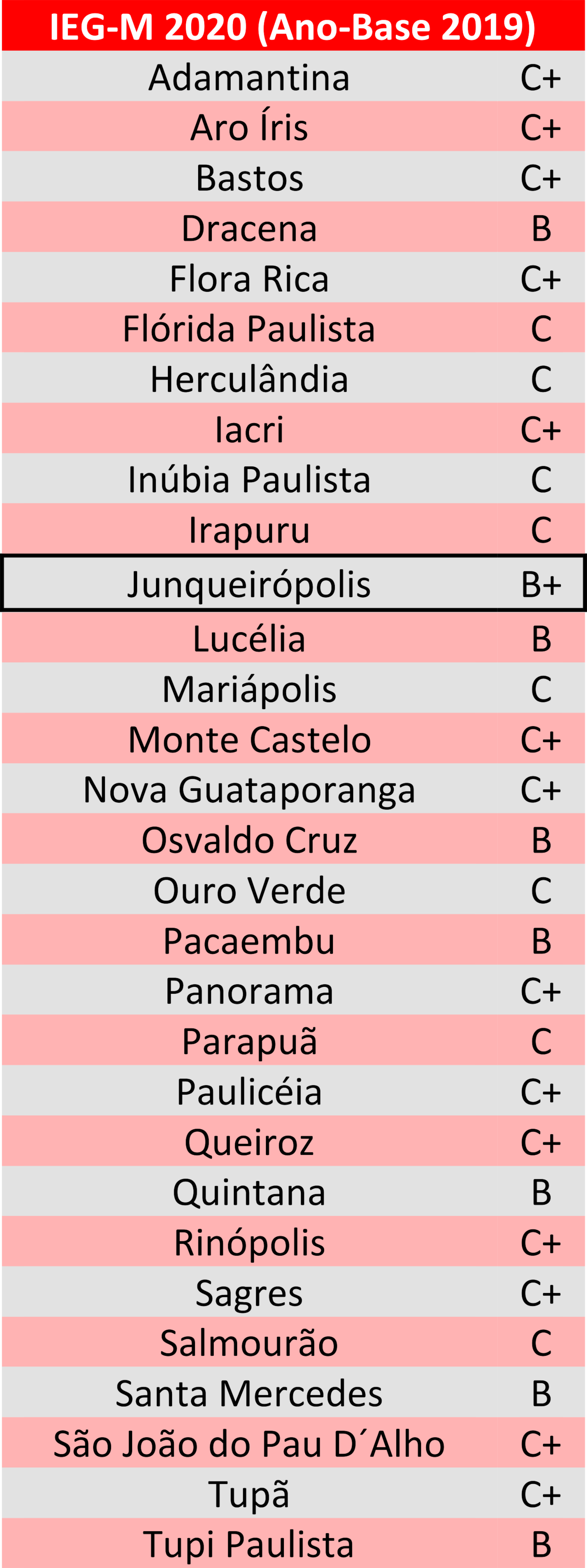 No geral, o IEG-M de Adamantina era “B” em 2019 e caiu para “C+” em 2020. O melhor IEG-M entre as cidades da Nova Alta Paulista, atualmente, é Junqueirópolis, com “B+”