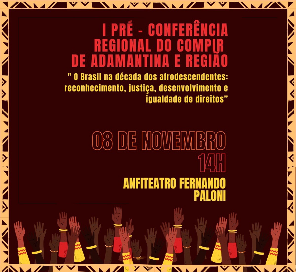 Adamantina sedia nesta quarta-feira (8) a 1ª Pré-Conferência Regional do Conselho Municipal de Promoção da Igualdade Racial (COMPIR), da região. A programação acontece a partir das 14h no Anfiteatro Fernando Paloni, centro da cidade. O evento é uma parceria entre a Secretaria Estadual da Justiça e Cidadania (SJC), por meio da Coordenadoria de Políticas para a População Negra (CPPN), e Prefeitura de Adamantina.