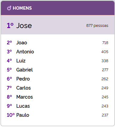 Entre os homens, José ocupa o topo, com 877 registros, seguido de nomes tradicionais: