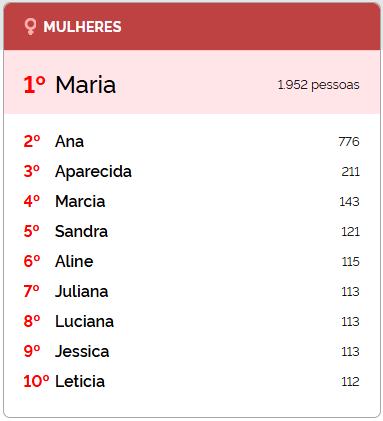 No ranking feminino, Maria aparece de forma disparada na primeira posição, com 1.952 registros. Veja todos os nomes: