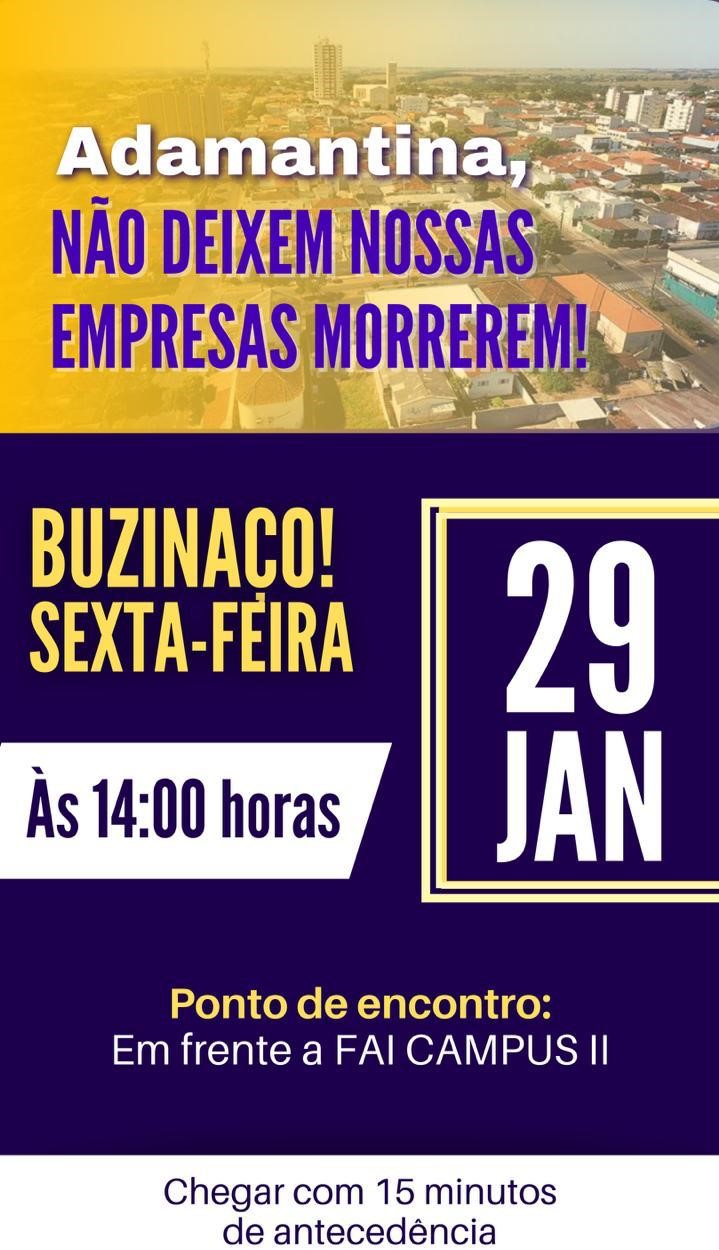 A mobilização dos empresários de Adamantina prevê para esta sexta-feira uma carreta e buzinaço pelas principais ruas da cidade. A concentração será nas imediações do campus II, com saída prevista para às 14h. A iniciativa quer sensibilizar as autoridades locais para o ambiente crítico vivido nos negócios e pede a reabertura do comércio, de forma controlada.