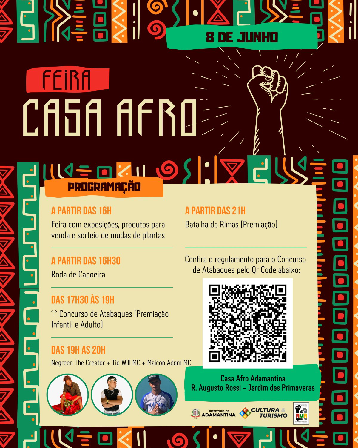 Integrando as comemorações aos 76 anos de Adamantina, domingo (8), a partir das 16h acontece a primeira edição da Feira Casa Afro de Adamantina. A programação terá exposição e comercialização de produtos temáticos, praça de alimentação com comidas típicas como acarajé e, ainda, cachorro quente, batata, churrasco, produtos indígenas, produtos de jatobá, artes, produtos veganos, entre outros.