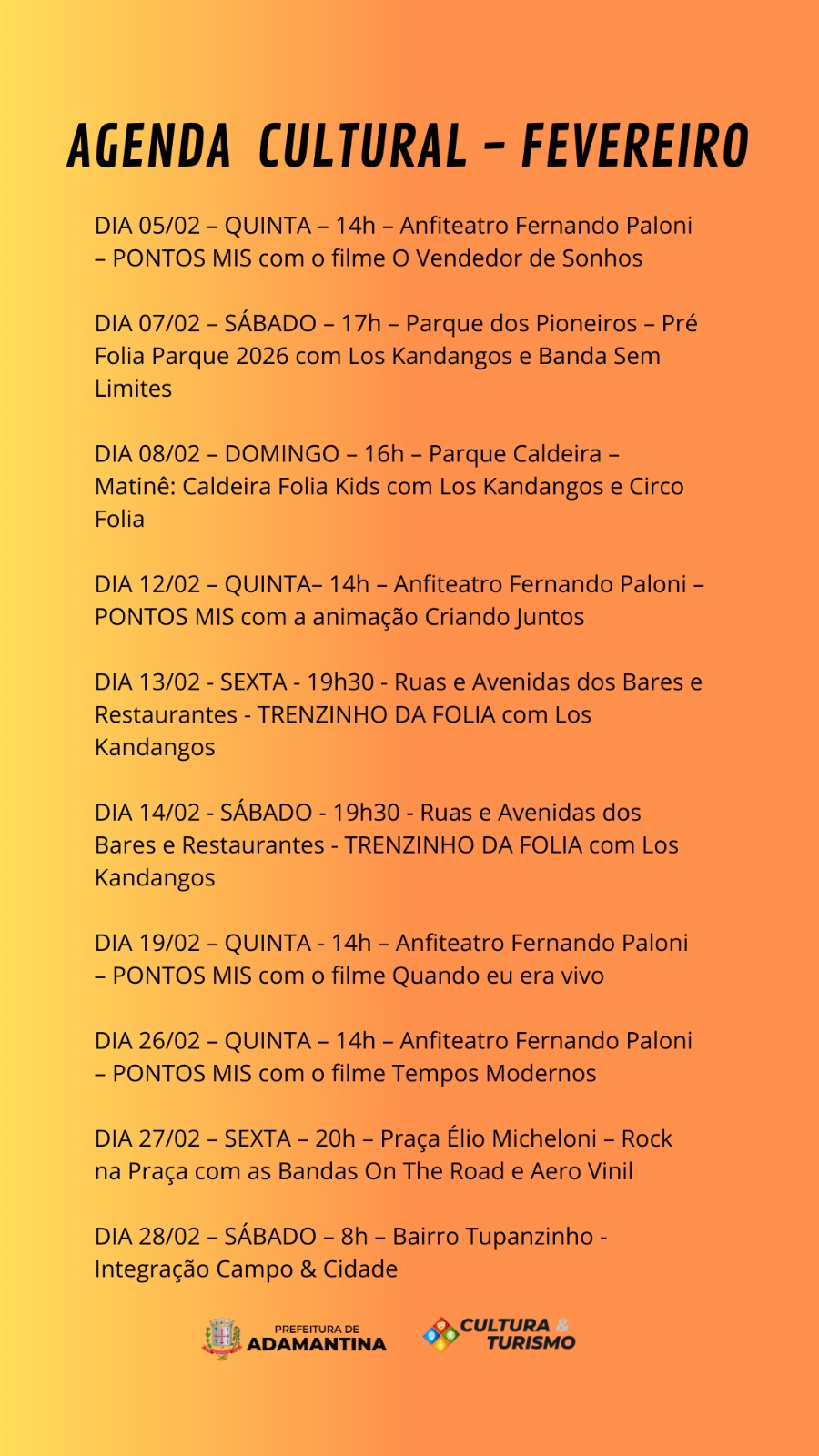 A maior festa popular brasileira que é o carnaval está chegando e a Prefeitura de Adamantina, por meio da Secretaria de Cultura e Turismo, preparou uma programação que tem início neste final de semana com a “Pré-folia Parque” no sábado (7), a partir das 17h no Parque dos Pioneiros com Los Kandangos e Banda Sem Limites.