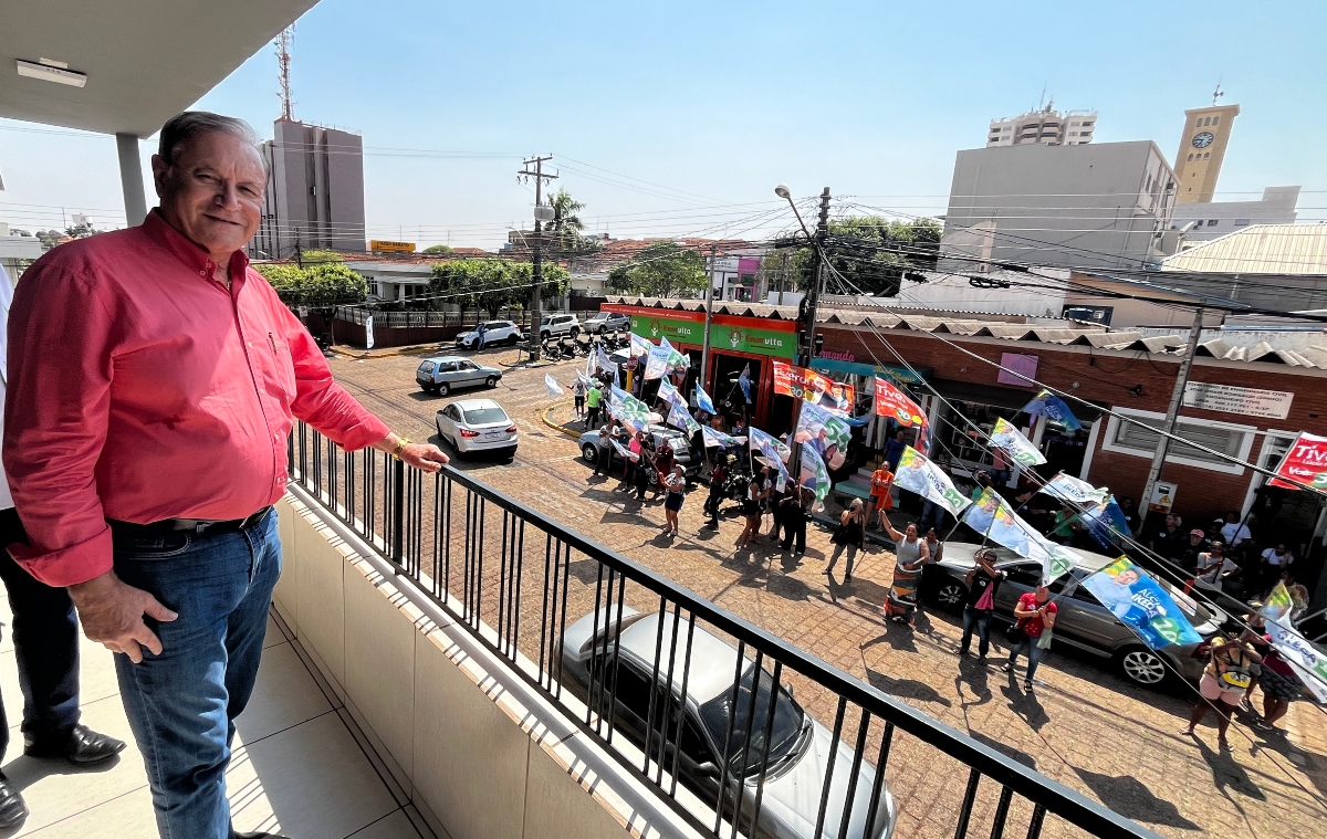 Jonas Bonassa na sacada da emissora e publico em apoio aos candidatos (Cedida).