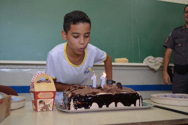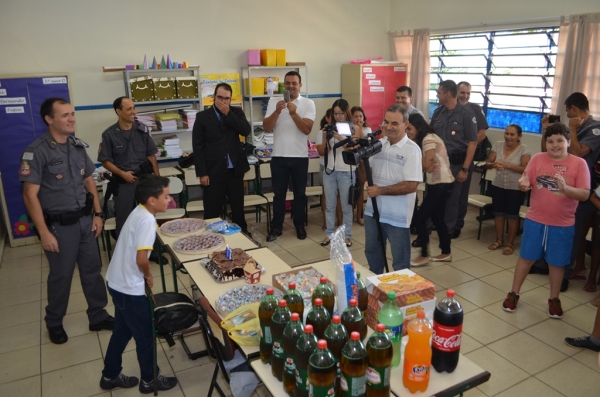 O estudante Pietro Ferreira da Silva Piaí, aluno do 5º ano, período da manhã, da Emef Profª Teruyo Kikuta foi homenageado hoje em uma festa surpresa, realizada na sala onde estuda, organizada pela Polícia Militar de Adamantina. Ontem (9) ele completou 11 anos e teve seu pedido atendido depois que deixou uma carta, escrita de próprio punho, na sede da PM local.