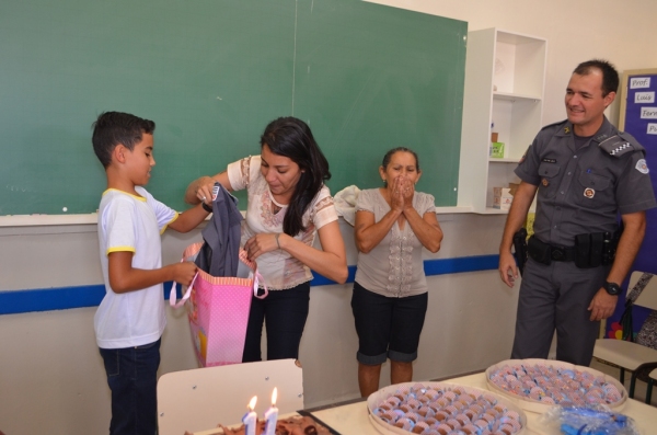 Aluno da Escola Teruyo ganha festa surpresa da Polícia Militar