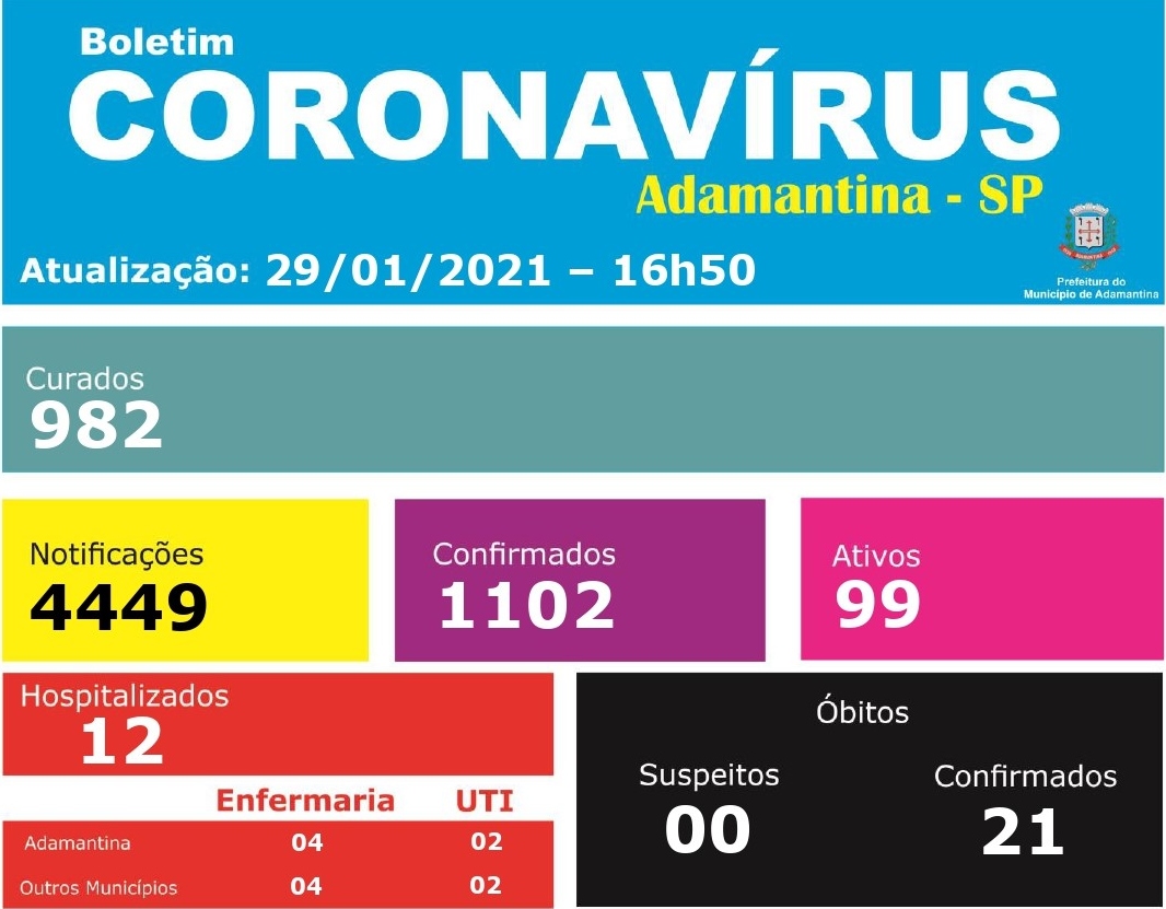 Quadro atualizado da Covid-19 em Adamantina, em 29 de janeiro (Divulgação/PMA).