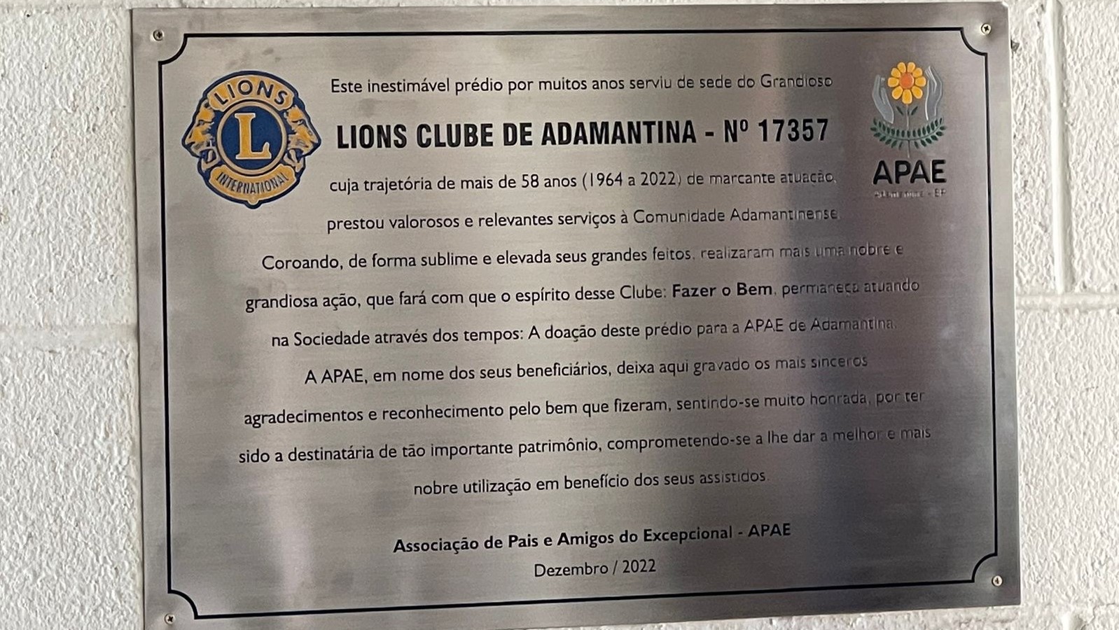Em um café da manhã nesta terça-feira (20) o Lions Clube de Adamantina anunciou a doação do prédio de sua sede à Apae local. O clube de serviço atuou na cidade desde 1964, por 58 anos, e encerrou sua trajetória ano passado. O espaço localizado à Alameda das Margaridas, 674, esquina do Poliesportivo, continuará sendo disponibilizado em locação para eventos (cerimônias, festas, casamentos, aniversários), permitindo uma nova fonte de receitas à Apae.
