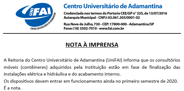 Os cursos da área de Saúde do Centro Universitário de Adamantina (UniFAI), entre eles Medicina, receberam no final do ano passado um reforço para o desenvolvimento dos estágios e do Internato. Seis consultórios médico móveis (contêineres) equipados e climatizados serão utilizados para o atendimento à população na atenção básica.