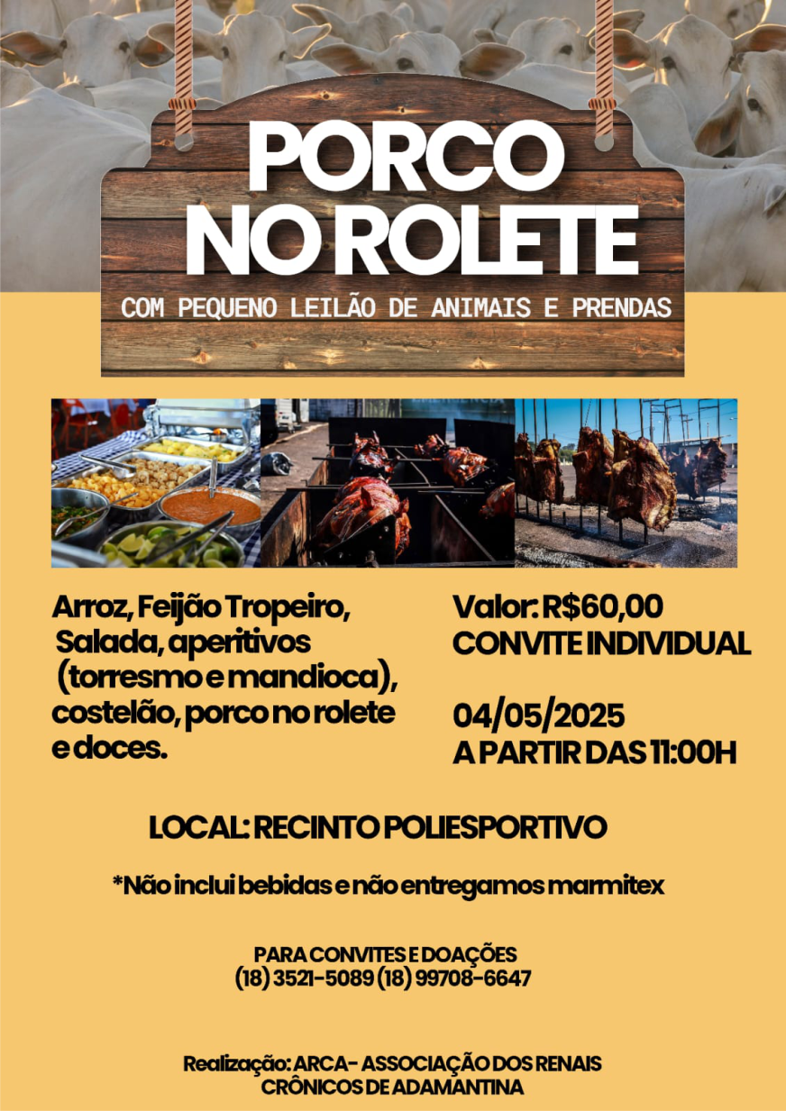 A Arca (Associação dos Renais Crônicos de Adamantina), que presta assistência complementar a pacientes renais crônicos e seus familiares, promove no dia 4 de maio seu tradicional porco no rolete. O evento conta ainda com leilão de prendas e animais.