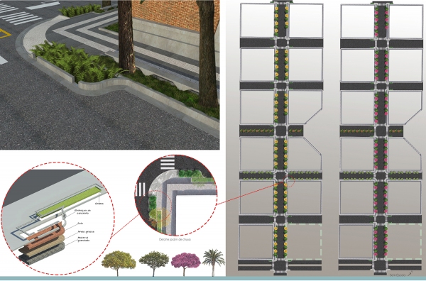 Além disso, com o alargamento das esquinas, estas ficam mais próximas com o lado oposto da via, facilitando a travessia de um lado para o outro da Avenida Rio Branco. Para direcionar os pedestres a atravessarem na faixa, foi proposto um jardim de chuva. Os canteiros verdes permeáveis, os jardins de chuva e as árvores caracterizam a implantação da estrutura ecológica urbana, sendo que, os dois primeiros aumentam a taxa de permeabilidade do solo que é tão rara na cidade