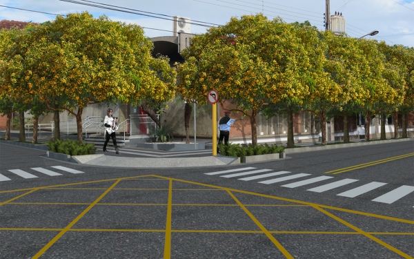 Deste modo, o projeto prevê também o alargamento das calçadas para melhorar a circulação de pessoas, bem como faixas de canteiros ao longo das sarjetas com árvores de médio porte para melhorar o microclima local, além de manter a pista de rolamento em uma só direção.