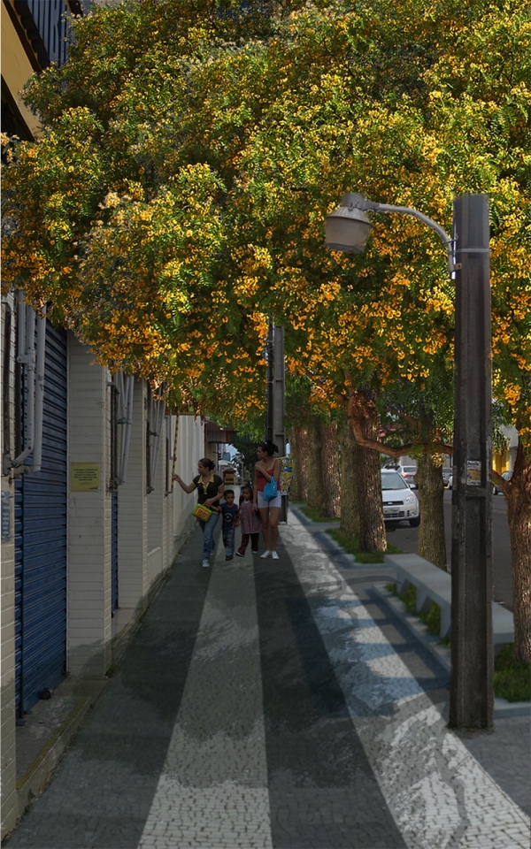 Assim, o aumento da calçada cria uma faixa de arborização de mesma largura (90 centímetros), com canteiros verdes de grama amendoim (Arachis repens) e árvores de médio porte que auxiliem a melhorar o microclima, intercalando o Falso Barbatimão (Cassia leptophylla) e a Quaresmeira (Tibouchina granulosa), que durante o ano florescem em meses diferentes, criando diferentes paisagens para a mesma avenida.