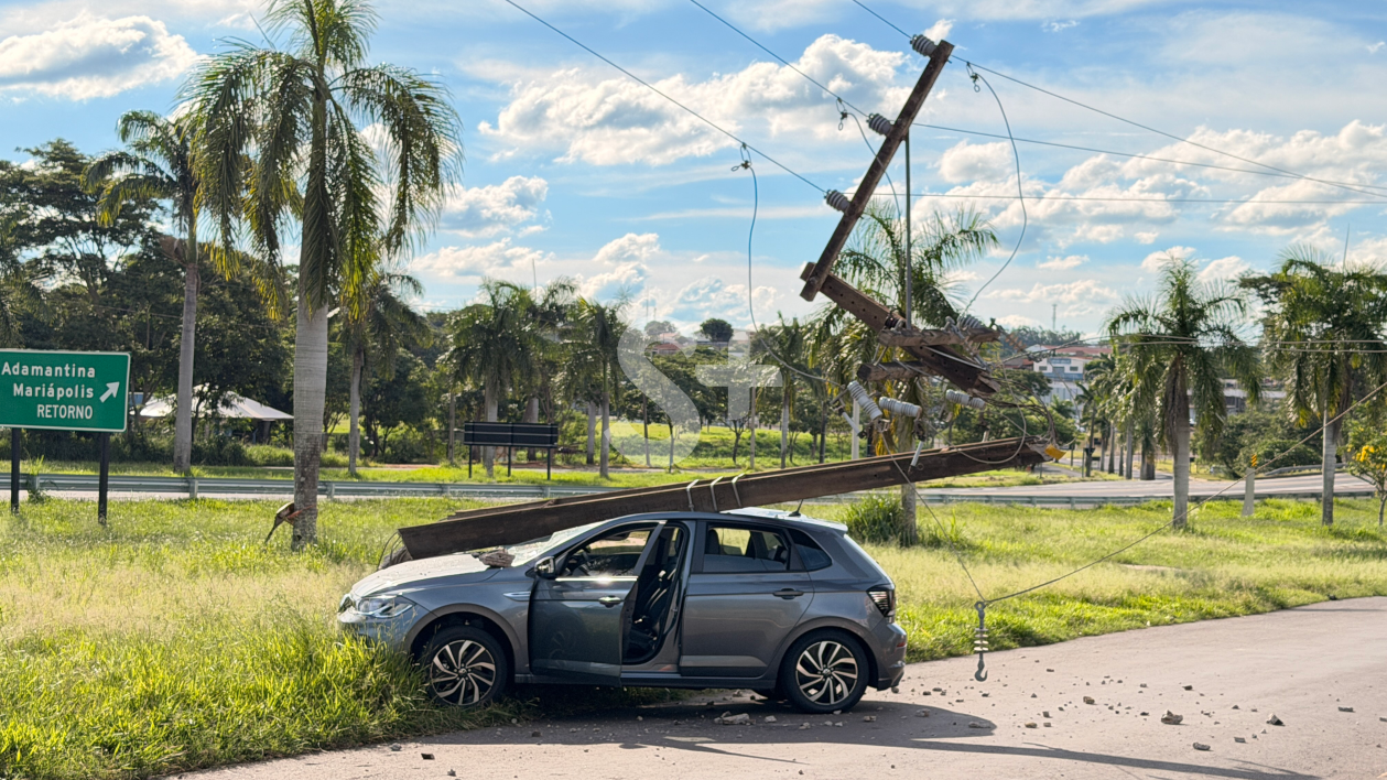 Um automóvel VW Polo, ainda sem emplacamento, colidiu contra um poste e derrubou a estrutura na tarde deste sábado (3), na Rua Carlos Pegoraro, no Distrito Comercial de Adamantina. A ocorrência foi por volta das 15h. O veículo era conduzido por um rapaz. Apesar do impacto da colisão e ficar exposto a uma rede de alta tensão de 13.800 volts, saiu ileso do acidente.