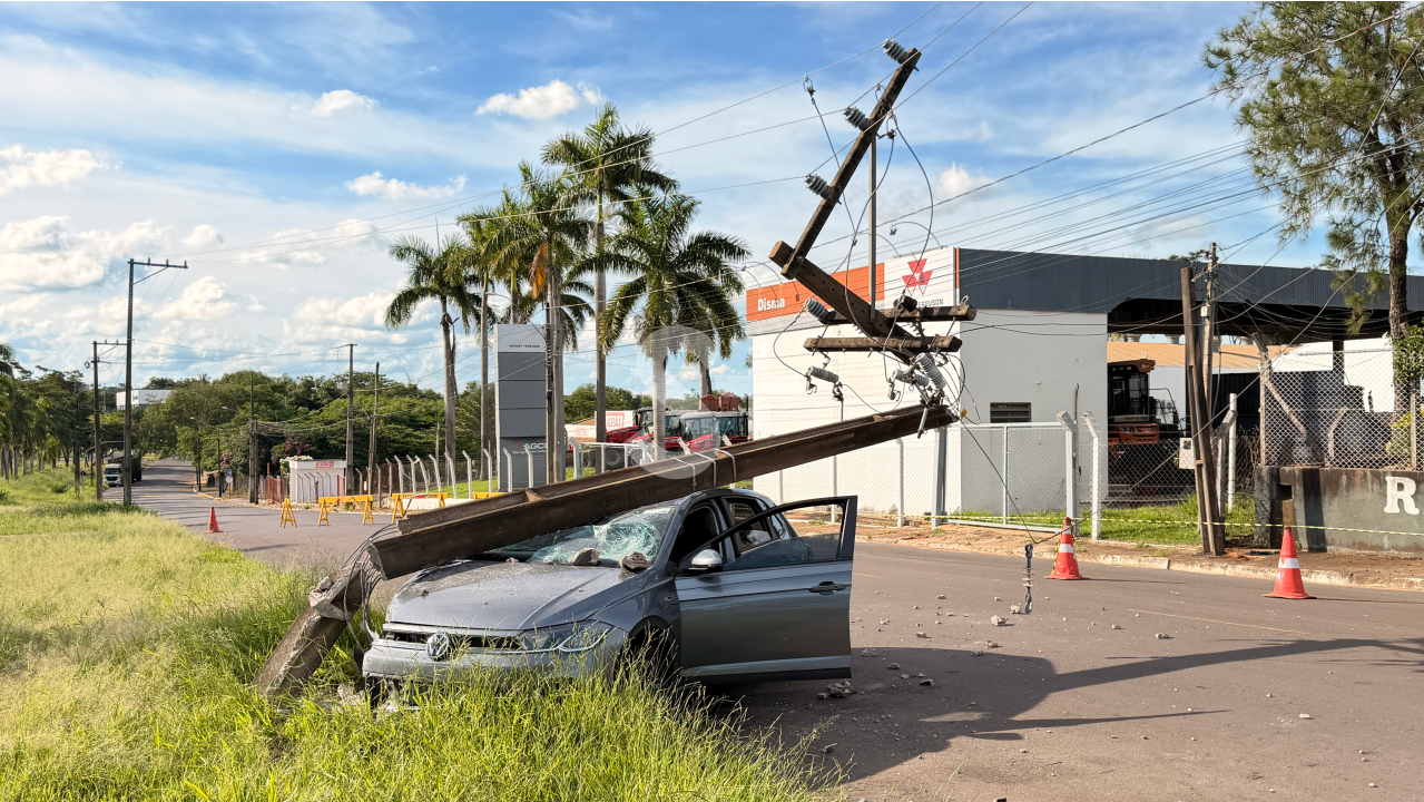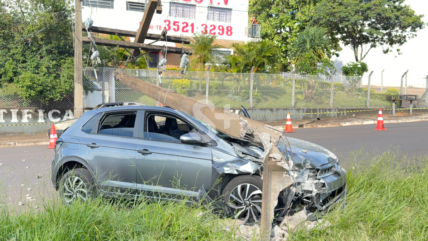 O veículo atingiu a estrutura do poste, que quebrou em três partes, cedeu e ficou contido pelo cabeamento elétrico. O carro sofreu danos sobretudo na parte frontal, capô do motor e teto superior. A Polícia Militar foi acionada. A documentação do condutor e do veículo estavam em ordem e foram lançadas no boletim de ocorrência. As circunstâncias serão apuradas.