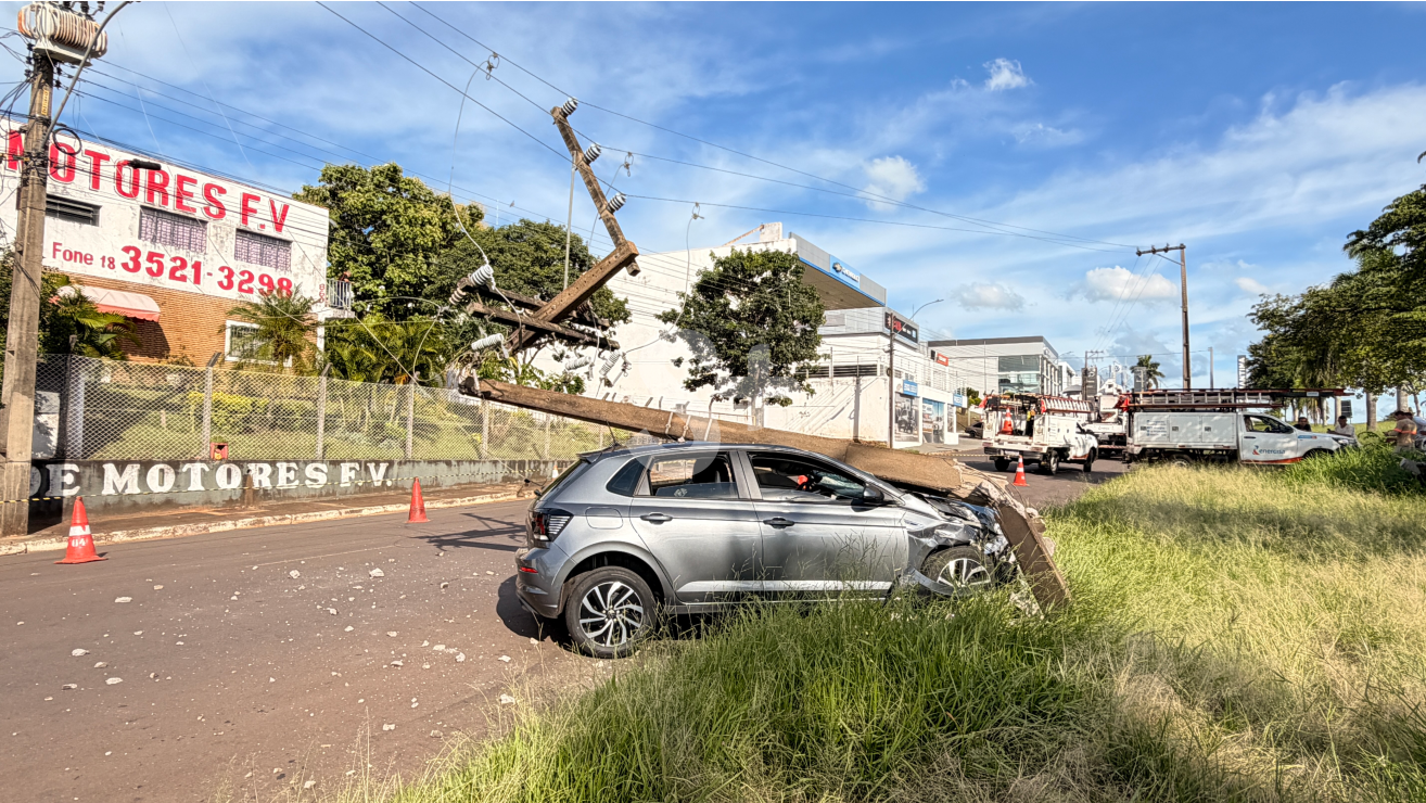 Automóvel ainda sem emplacamento colide com poste e derruba estrutura em Adamantina