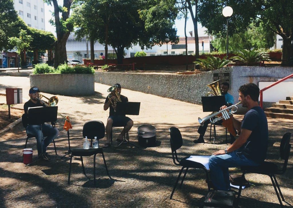 Parte dos integrantes voltaram aos ensaios em local aberto na praça Élio Micheloni.
