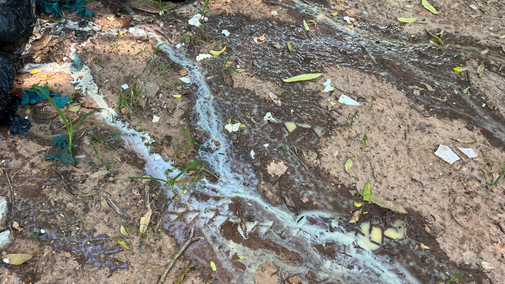 Aos fundos de onde estava estacionado em ré, foi depositado um grande volume de bandejas de papelão com restos de ovos, e materiais ensacados, exalando forte odor. Também escorreu material líquido, dos ovos, pelo solo. O volume já estava tomado por moscas.