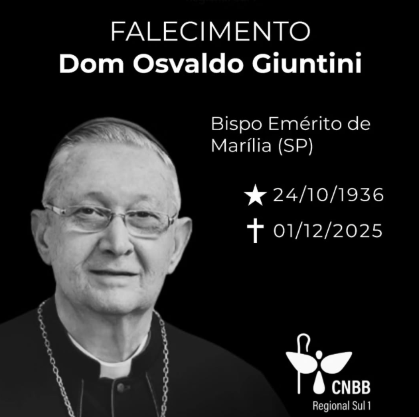 “Dom Osvaldo dedicou-se com generosidade ao serviço da Igreja, conduzindo o rebanho que lhe foi confiado com coragem pastoral, sabedoria espiritual e profunda caridade. Sua vida simples, marcada pela fidelidade ao Evangelho, permanece como testemunho luminoso para todos nós”, publicou no Instagram. “Manifestamos nossa solidariedade à Diocese de Marília, a Dom Luiz Antônio Cipolini, aos familiares e amigos, assegurando nossa oração e proximidade neste momento de dor”, assina Dom Moacir Silva, presidente do Regional Sul-1.