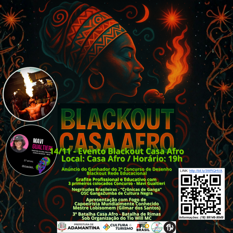 Durante o “Blackout Casa Afro”, será anunciado o ganhador do 2º concurso de desenho, os três primeiros colocados do concurso farão um grafite profissional e educativo com a artista Mavi Gualtieri.