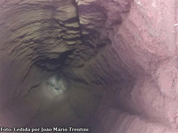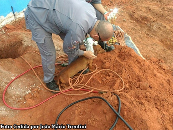 Animal caiu em uma broca, com 6 metros de profundidade, em obra, e foi resgatado ileso.