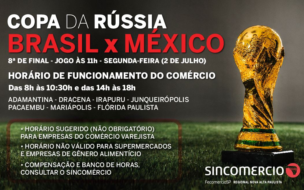 Nesta segunda-feira (2), a seleção brasileira entra em campo às 11h, contra a seleção do México, na disputa das oitavas de final da Copa do Mundo da Rússia. Em Adamantina, o comércio, repartições públicas e bancos têm horário especial de atendimento.