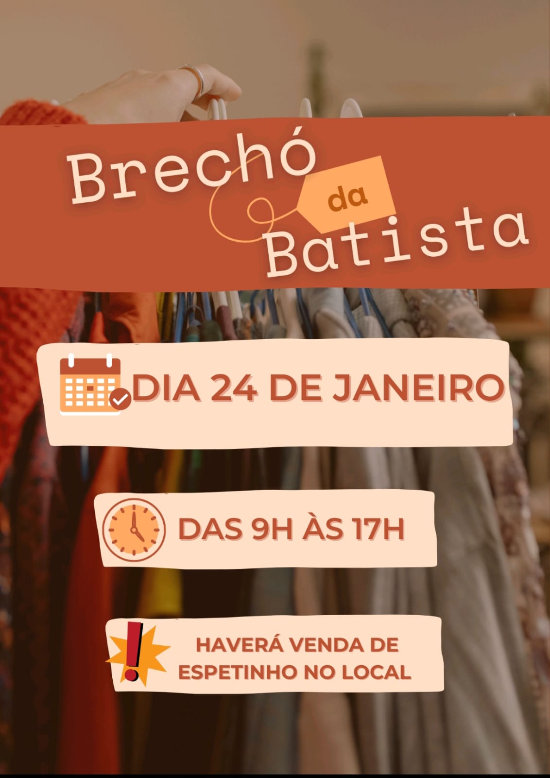 A Primeira Igreja Batista de Adamantina promove neste sábado, 24 de janeiro, o “Brechó da Batista”, um evento que une solidariedade, confraternização e boas oportunidades. A ação será realizada das 9h às 17h, na sede da igreja, localizada na alameda Dr. Armando de Salles Oliveira, 360.