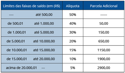 O valor do saque anual será equivalente a um percentual do saldo da conta, para todas as faixas, mais um valor fixo para contas a partir de R$ 500,01, conforme a tabela abaixo: