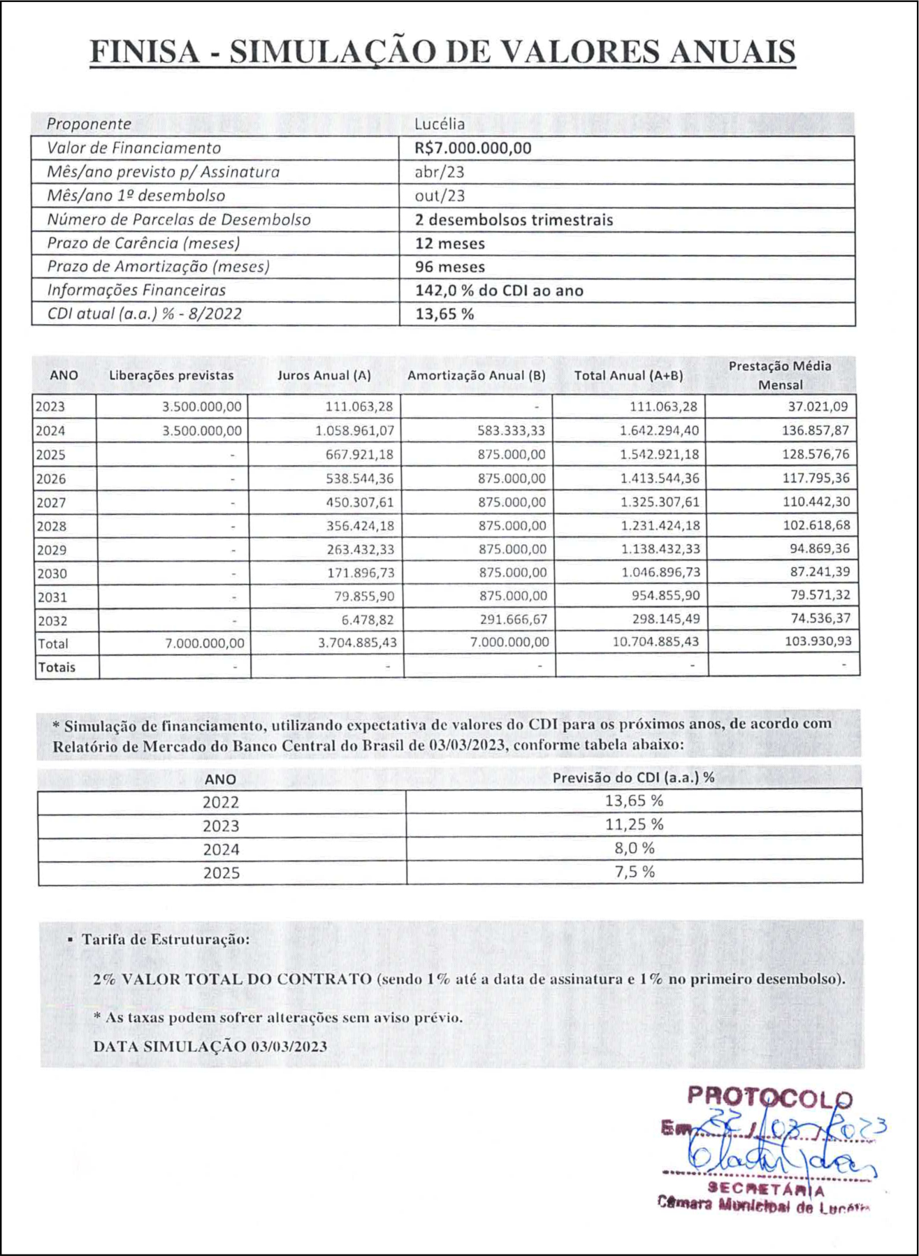 A proposta diz que a contratação do empréstimo pode ocorrer já a partir de abril, já com a primeira liberação de R$ 3,5 milhões. Havendo a contratação, o observando a carência prevista de 12 meses, o pagamento da primeira parcela ao agente financeiro ocorrerá em abril do ano que vem. Observando a projeção de pagamento em 96 meses, a última parcela venceria em 2032, afetando pelo menos duas gestões municipais. O valor contratado de R$ 7 milhões teria um custo financeiro final de R$ 10.704.885,43. As 96 parcelas mensais são projetadas em R$ 103.930,93.