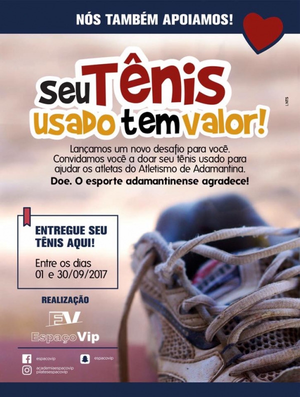 A Academia Espaço Vip, de Adamantina, promove pelo terceiro ano consecutivo a campanha “Seu tênis usado tem valor”. A iniciativa visa arrecadar tênis usados, em bom estado de conservação e qualquer numeração, que posteriormente serão doados a crianças e adolescentes que praticam atletismo em programas esportivos locais.