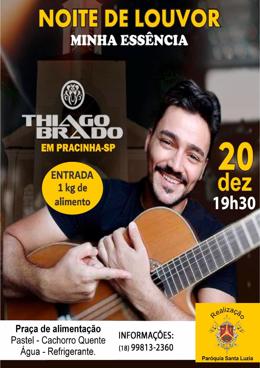 A Paróquia Santa Luzia, de Pracinha, promove nesta segunda-feira (20) uma noite de louvor com o cantor católico Thiago Brado. A programação será aberta às 19h30, em frente à Igreja Matriz.