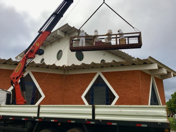 Foram retomados os trabalhos de troca do telhado da capela Nossa Senhora Aparecida. As antigas telhas, deterioradas pela ação do tempo, serão substituídas por material mais leve e resistente. No total serão colocados mais de 700 m² de telhas galvalume.