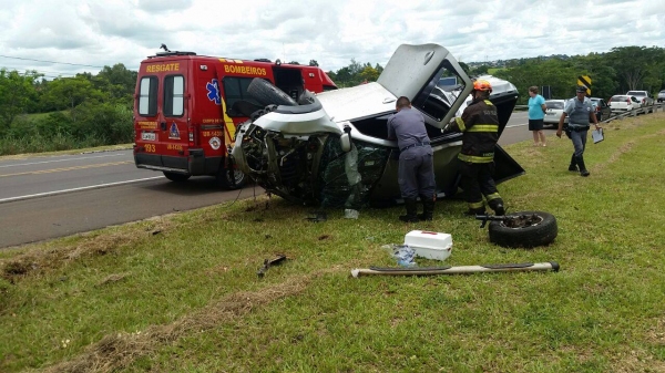Capotamento deixou duas vítimas leves. Acidente foi próximo à Base da Polícia Rodoviária.
