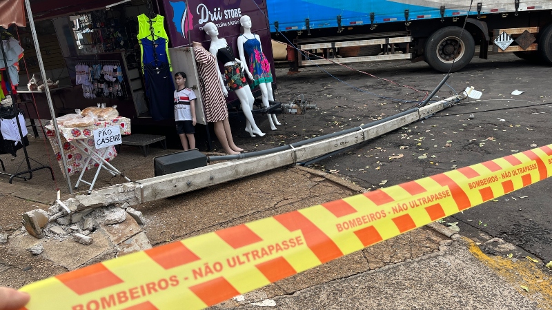 Carreta baú arrasta fios e derruba padrão de energia no pátio da feira livre em Adamantina