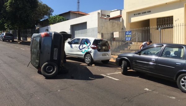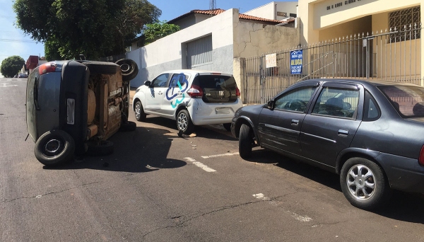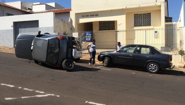 Depois de atingir dois carros, automóvel tomba na Rua Euclides da Cunha, centro de Adamantina.